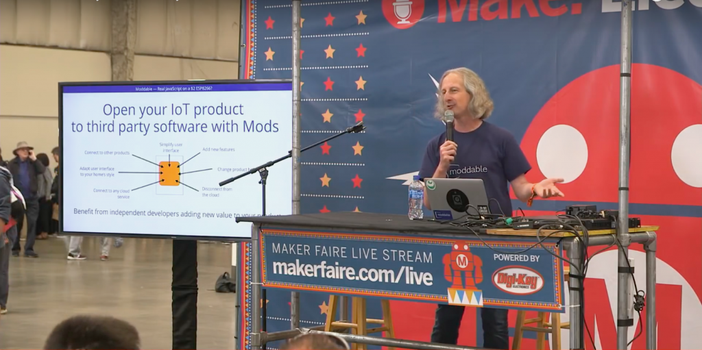 Peter Hoddie presented on the Make: Electronics stage on the final day of the show. His talk included an overview of the features of the Moddable SDK, videos of example apps running on