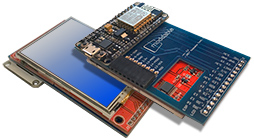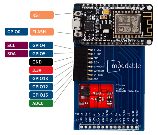 The two main components of Moddable Zero are the ESP8266 module and resistive touch screen. The ESP8266 module includes a Wi-Fi antenna and 4 MB of flash storage memory. The touch screen is a 240 x 320 QVGA display with 16-bit pixels driven by an ILI9341 display controller and an XPT2046 resistive touch controller.